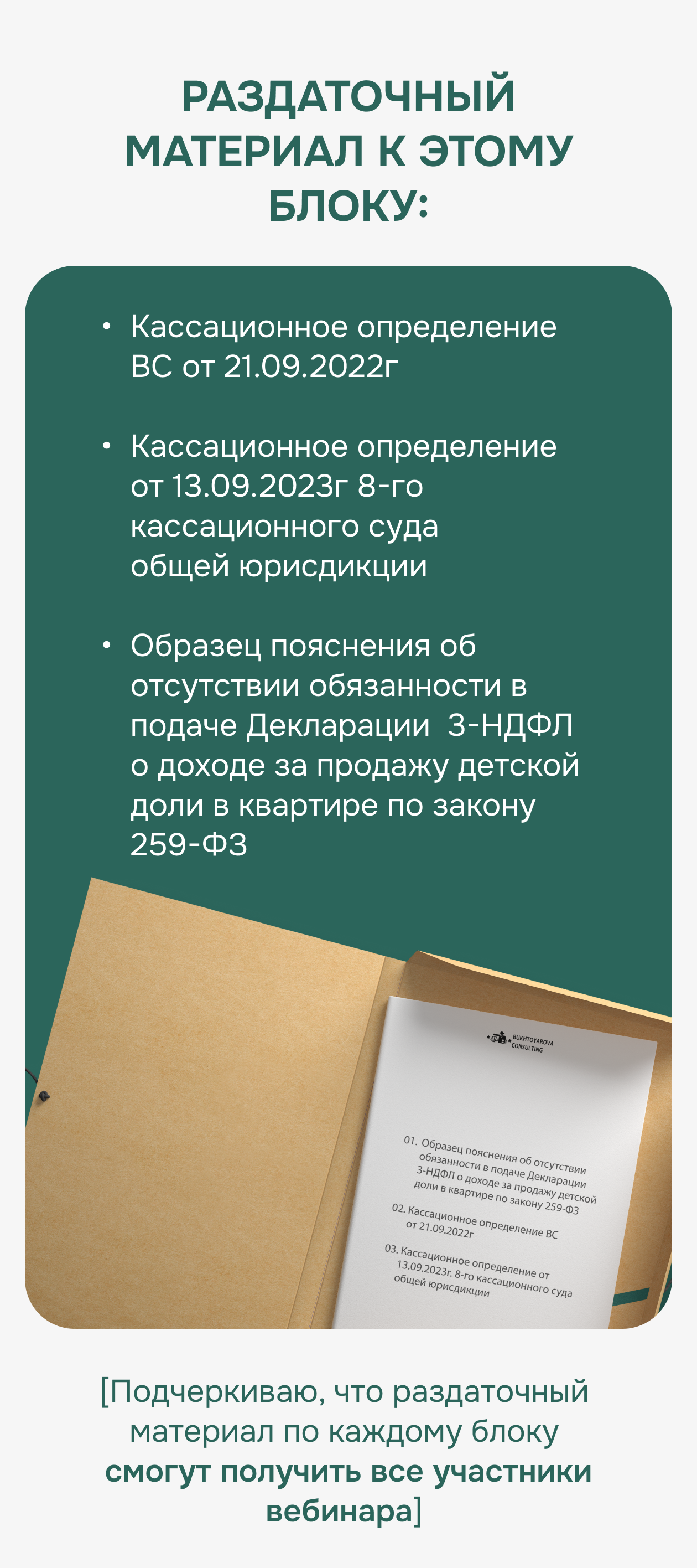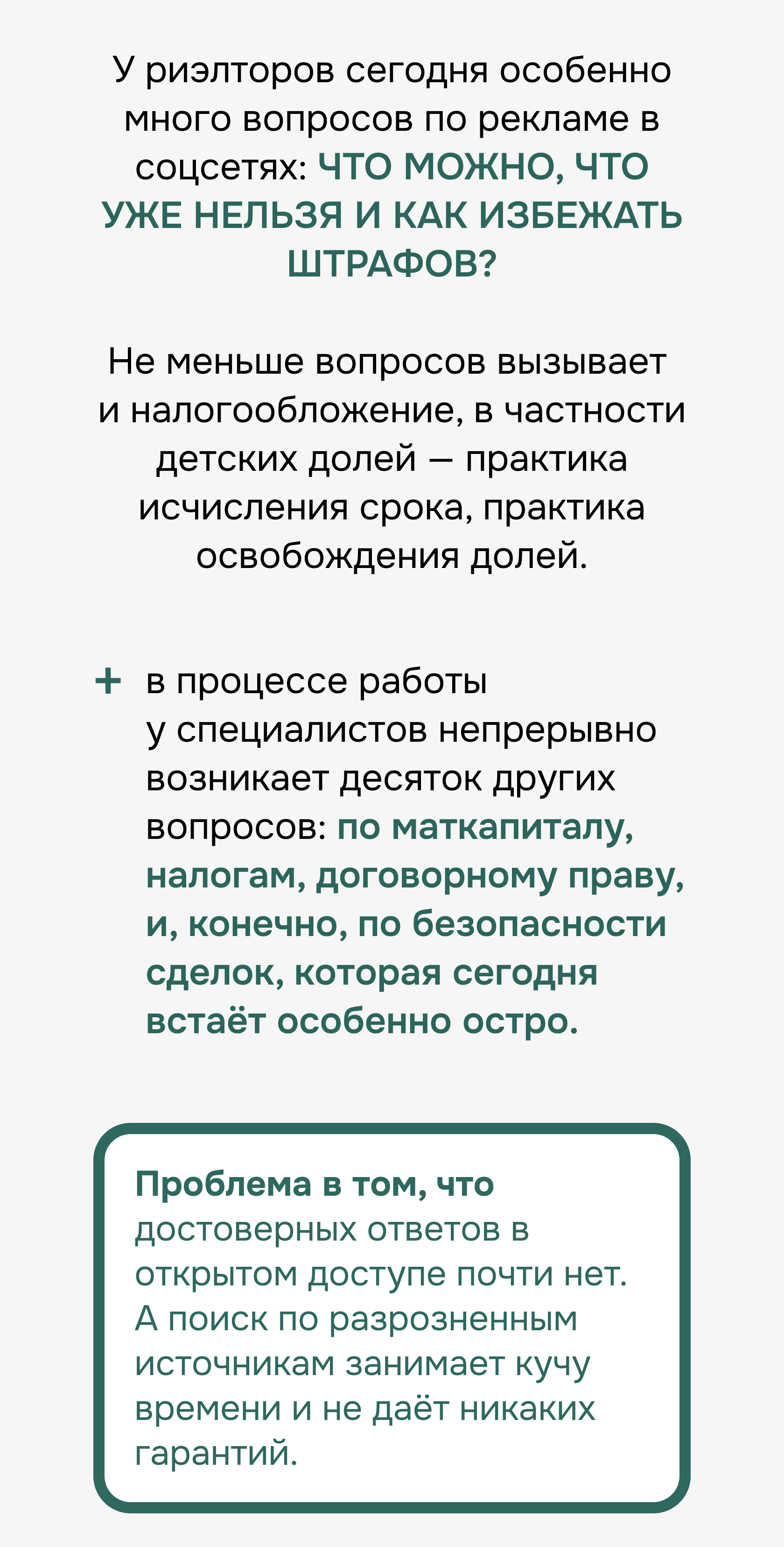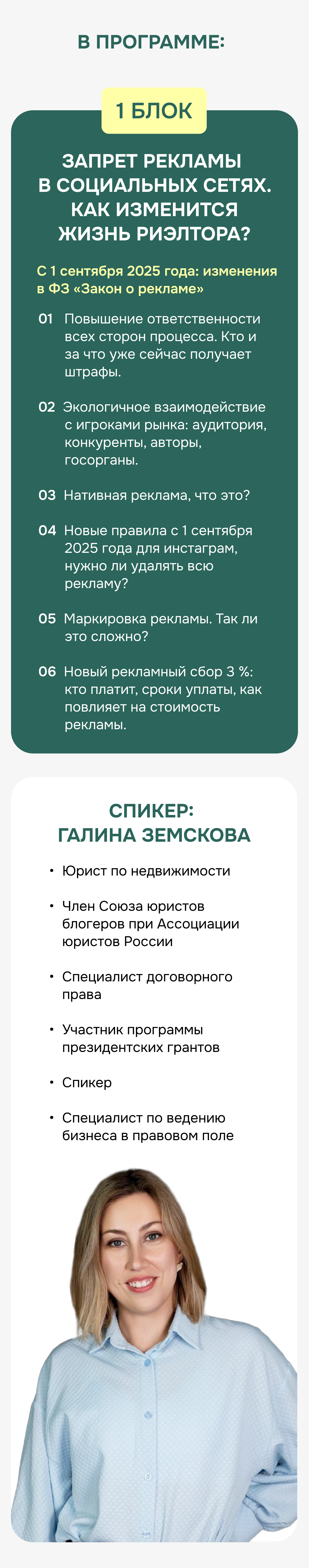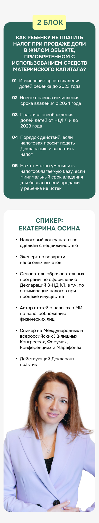 Финальная часть — разбор тем, которые сегодня волнуют рынок больше всего: налоги, материнский капитал, тренды безопасных сделок, договорное право, загородная недвижимость.