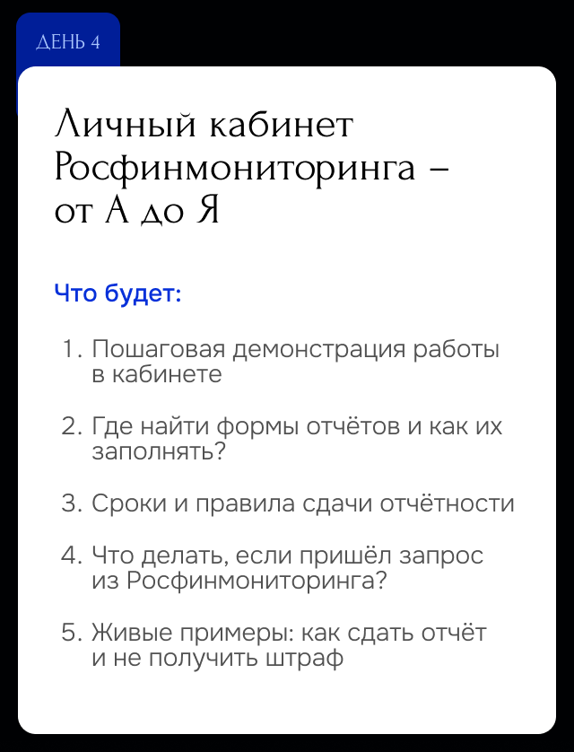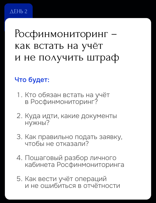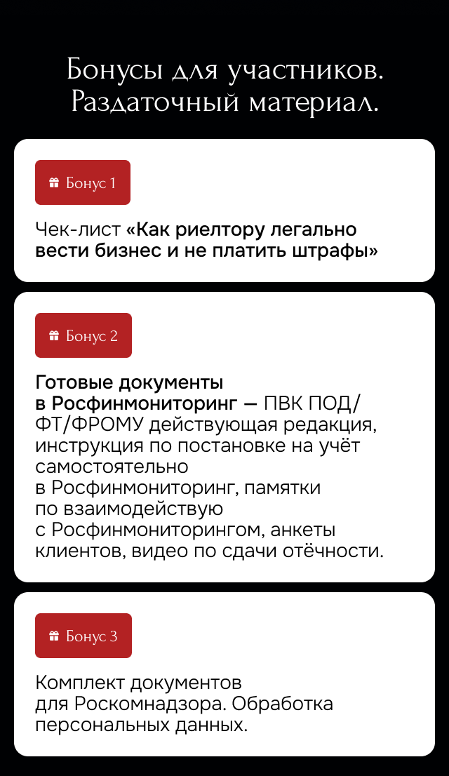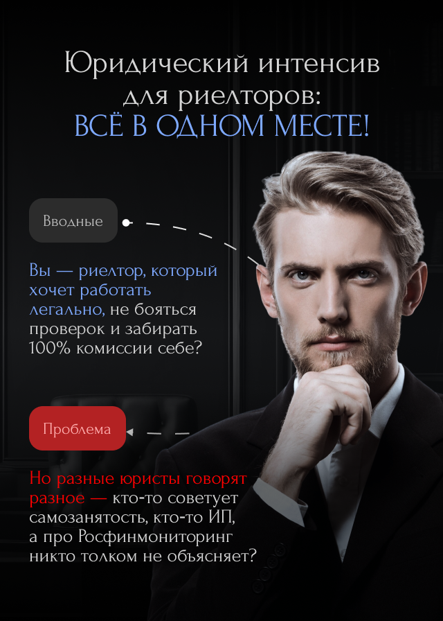• Налоговый консультант, юрист, главный бухгалтер, специализирующийся на защите и ведении законной предпринимательской деятельности по Росфинмониторингу (115-ФЗ) самостоятельных экспертов рынка недвижимости и агентств недвижимости.